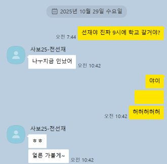 동기한테 같이 분석하게 9시에 나오라고 해놓고 정작 본인은 늦었다.(반성하는 모습도 없이 웃는 모습)